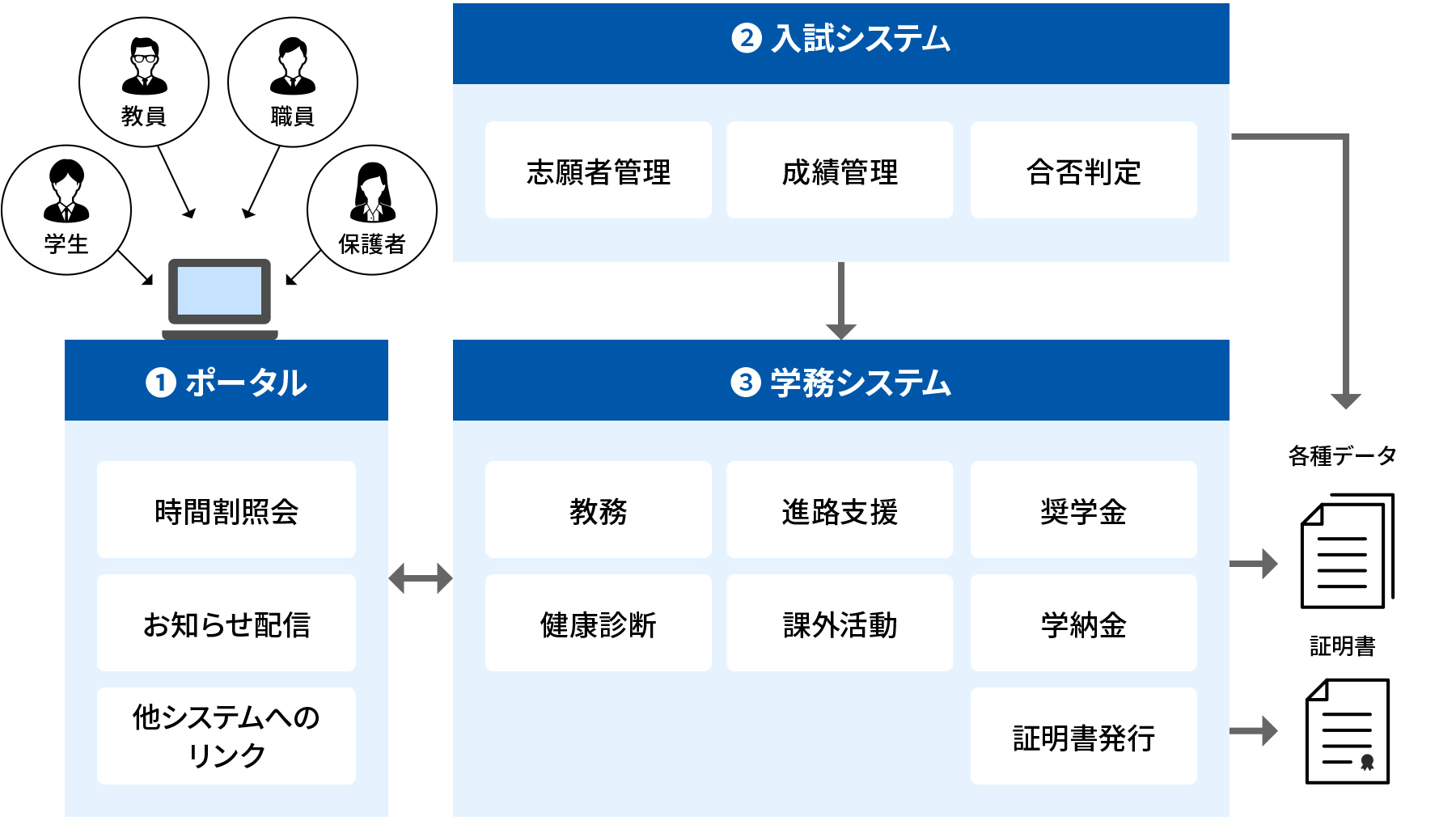学生の入学から卒業までの各種情報を管理し、利用者(学生・教員・教職・保護者)をサポートします。