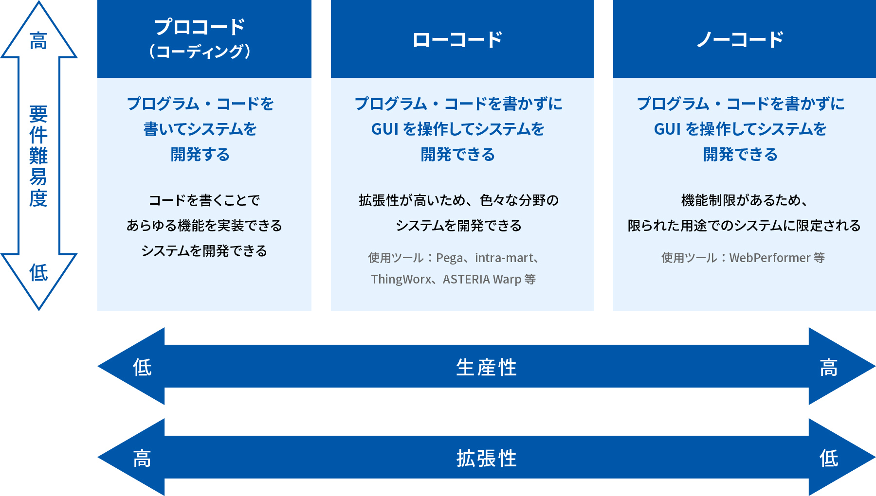 「ローコード」「ノーコード」には、従来のコンピュータへの指示を記述するソースコード(コーディング)を書く開発手法と比較すると拡張性が劣るものの次のような優位性があります。